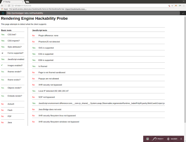 有些客户端所做的工作不仅是下载页面-实际还有渲染和执行javascript。这样的话会使攻击面很大,没办法手动去做映射,所以我的同事Gareth Heyes创建了一个名为“Rendering Engine Hackability Probe”的工具,用于完整的指纹识别客户端的功能。除了识别自定义浏览器中的常见故障(如忽略执行SOP),它还能标记了不寻常的JavaScript属性。