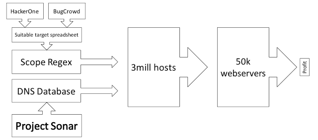为了按上面说的做,最开始我选择了Masscan和Burp Collaborator,但最后用Zmap/ZGrab代替了Masscan,因为它支持HTTP1.1和HTTPS。为了将pingback与目标相关联,我将目标主机名和每个payload进行了简单的相加,如果在example.com存在漏洞那么会导致DNS查找example.com.collaboratorid.burpcollaborator.net。这些目标域名和IP地址都是来自公开或者私有的漏洞悬赏中可测试的域名名单,接着我将这些域名和IP映射到Rapid7的Project Sonar Forward DNS数据库中。通过这个技术,我确定了几百万个IP地址,其中大约50000台主机监听着80/443端口。最初我试着使用反向DNS记录,但我发现了许多服务器伪装成google的基础设施,而且它们并对突如其来的安全审计表示了不欢迎。