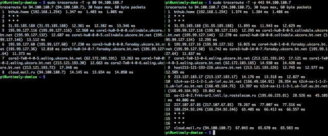 在尝试错误的主机技术时,因为有些攻击载荷发送到完全不相关的公司(其中包括cloud.mail.ru),我发现了它们的pingbacks都来自一小块IP地址。最初我假设这些公司必须共同使用相同的云WAF解决方案,接着我发现可以欺骗这些服务器将我的请求错误的路由到到其内部管理界面。不过事情并不是一直顺利的,这个IP池的反向DNS解析是bn-proxyXX.ealing.ukcore.bt.net - BT是英国电信公司的ISP。从英国肯特发送一个攻击载荷到俄罗斯,获取的pingback是不可预料的。我决定使用Burp Repeater进行调试,调试中我发现响应在50ms内回来,这快得让人质疑,毕竟这是从英国到俄罗斯的请求,然后到爱尔兰的数据中心,最后从俄罗斯回到英国。于是我使用Traceroute,接着80端口的TCP跟踪信息揭示了事实: